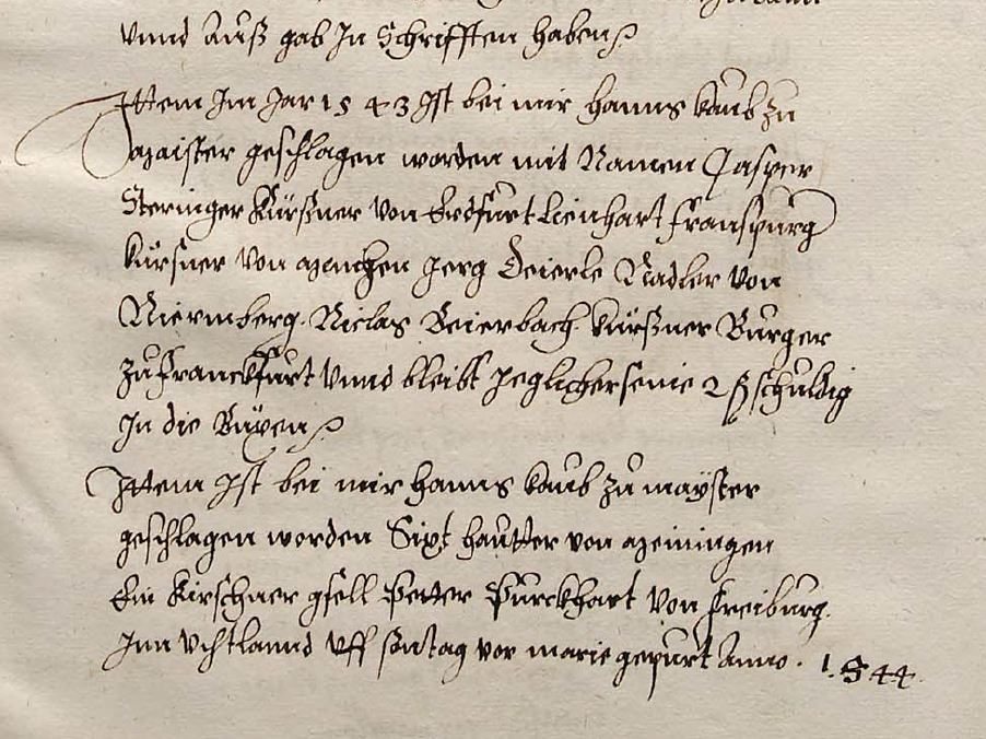 1543 – Frankfurt am Main – Caspar Sterninger, Kirschner aus Erfurt, wird von Hauptmann Hans Kaub zum Meister geschlagen.