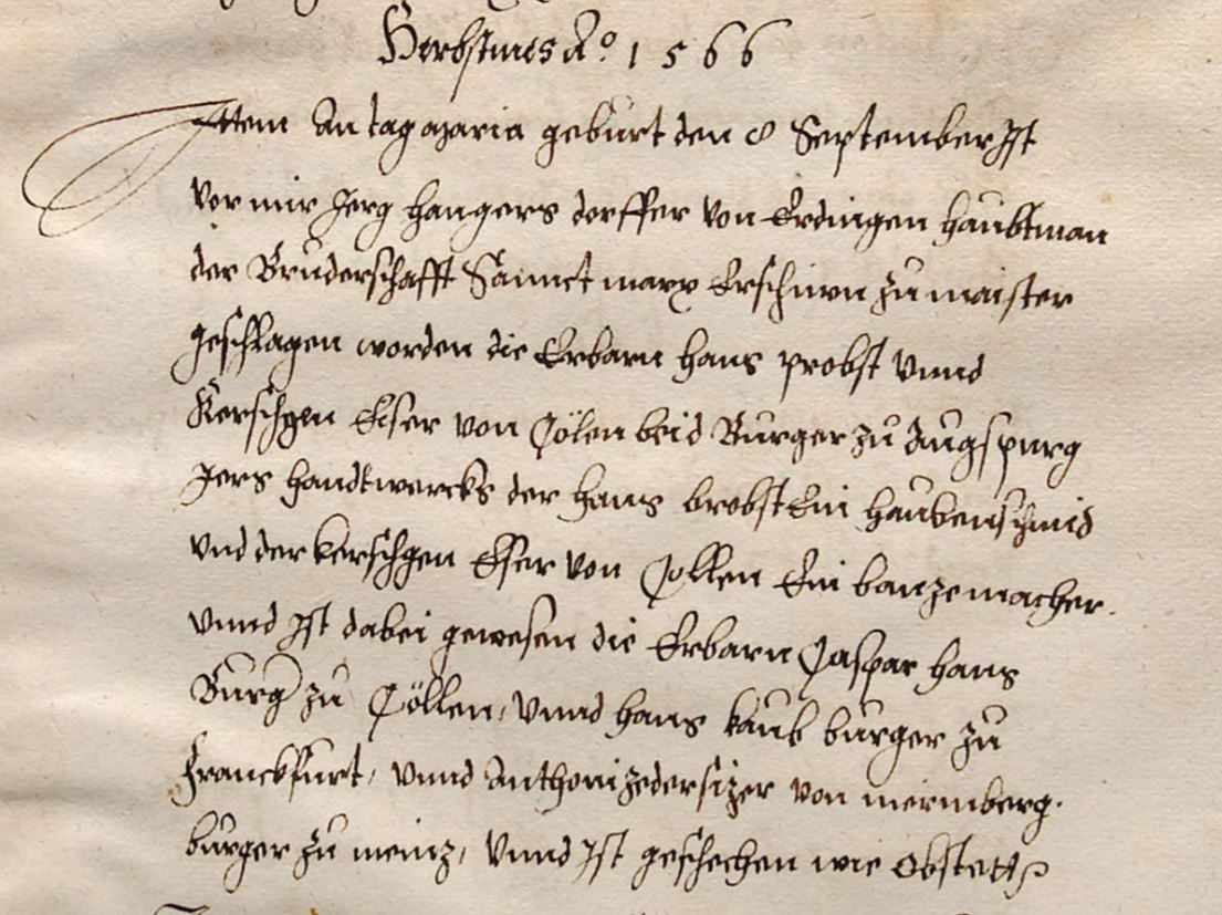 Jttem an tag maria geburt den 8 September jst vor mir jerg hangersdorffer von Erdingen haubtman der Bruderschafft Sannct marx Erschinen zu maister geschlagen worden die Erbarn hans probst vnnd kerschgen Eiser von Cölen beid Burger zu augspurg jers handtwercks der hans brobst Ein haubenschmid vnd der kerschgen Eser von Collen Ein banzemacher vnnd jst dabei gewesen die Erbarn caspar hans Burg<er> zu Cöllen, vnnd hans kaub burger zu Franckfurt, vnnd anthoni zedersizer von niermberg burger zu meinz, vnnd jst geschechen wie obstett /